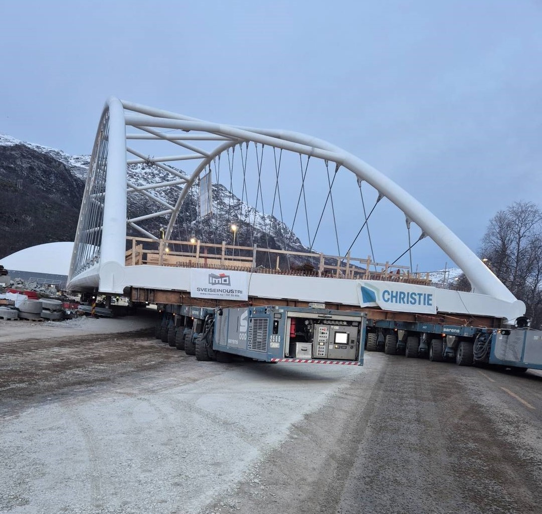 Video som viser transport fra idrettsbane, hvor bru er montert/sveist sammen, til den er plassering over Reisaelva.